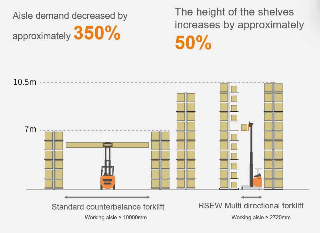 La carretilla elevadora multidireccional RSEW es una carretilla retráctil operada por conductor sentado adecuada para apilar en pasillos estrechos y manipular materiales largos de 3 a 10 m de longitud (como perfiles de metal, placas, paneles de vidrio, tuberías, etc.), con dirección de 360° con todas las ruedas y una altura máxima de elevación de 10,5 metros.