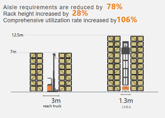 El recogepedidos de alto nivel LHEA es adecuado para operaciones de picking en pasillos estrechos, con una altura de elevación de 3 a 12,5 m. Solo se necesita un pasillo estrecho de 1,3 a 1,8 metros para completar el picking de mercancías en ambos lados de las estanterías.