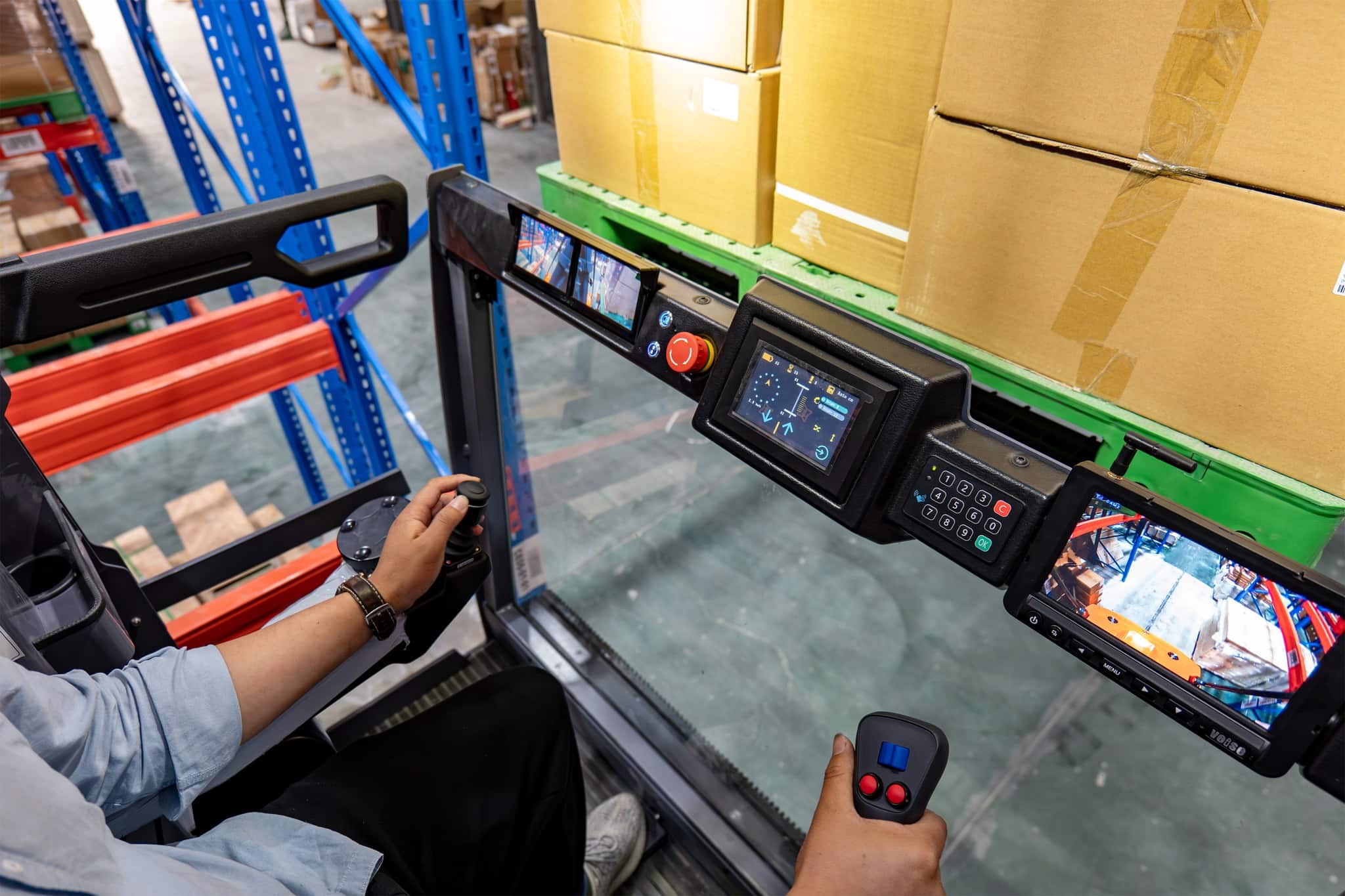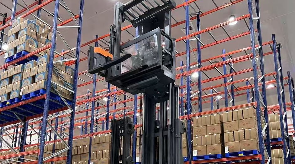 La carretilla elevadora trilateral VUE es una carretilla elevadora de pasillo estrecho que combina funciones de apilado y picking. Su gran capacidad de carga garantiza la estabilidad y seguridad del vehículo al trabajar en altura.