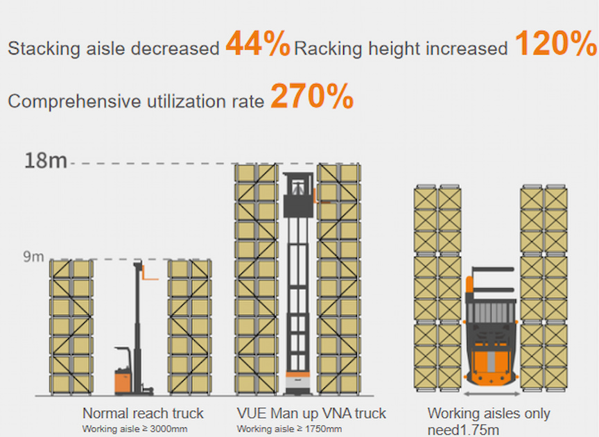 La nueva generación VUE cuenta con una impresionante altura máxima de elevación de 18 m y una carga útil máxima de 1.600 kg; su estrecho pasillo de 1,75 m aumenta significativamente la utilización del espacio del almacén, lo que lo hace aún más valioso.