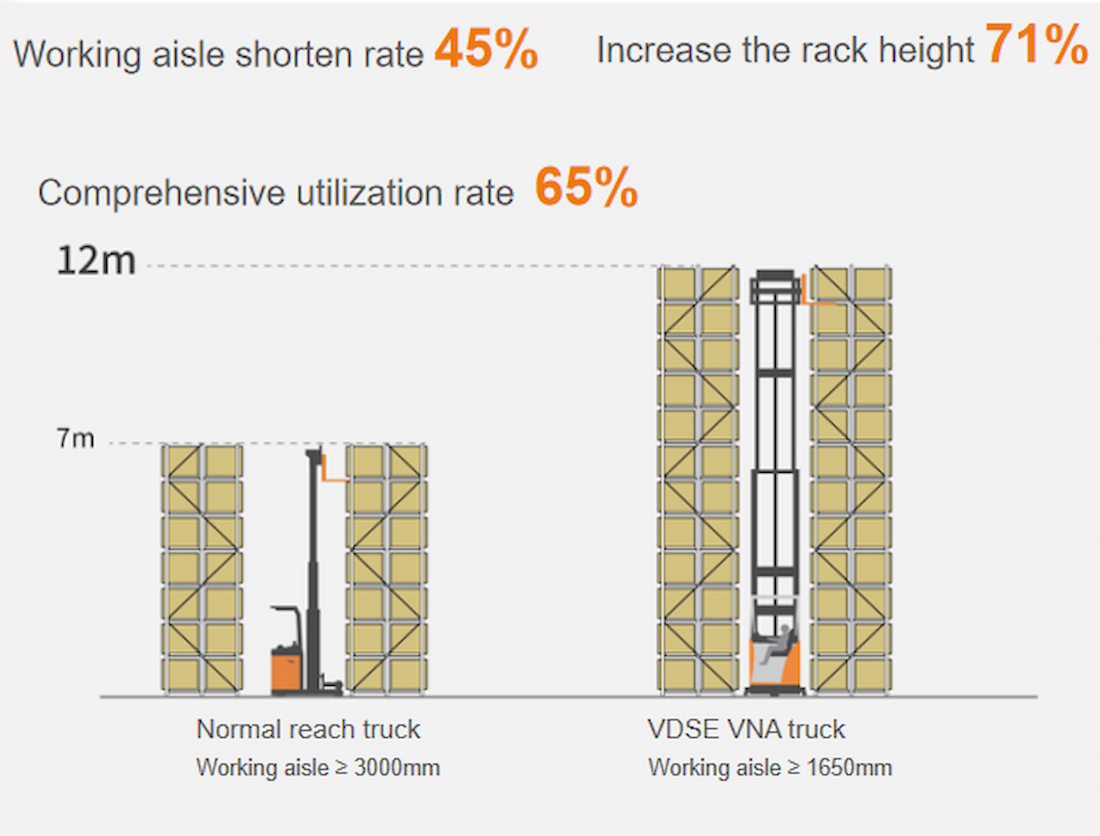 El asiento de hombre abajo Zowell VDSE en montacargas VNA está diseñado para operaciones en pasillos extremadamente estrechos y ofrece un manejo conveniente y eficiente.