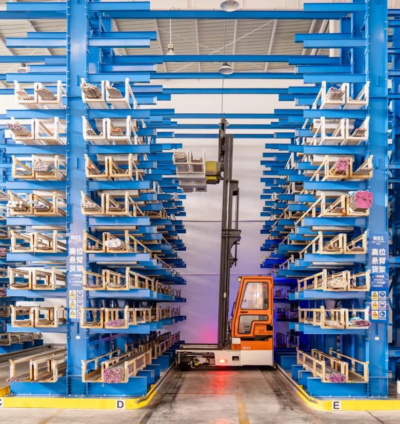 La serie WSHM se destaca en el almacenamiento de materiales largos en pasillos estrechos, reduciendo significativamente los requisitos de ancho de pasillo , lo que permite colocar más estantes dentro de un espacio de almacén limitado y mejora enormemente la utilización del almacenamiento.